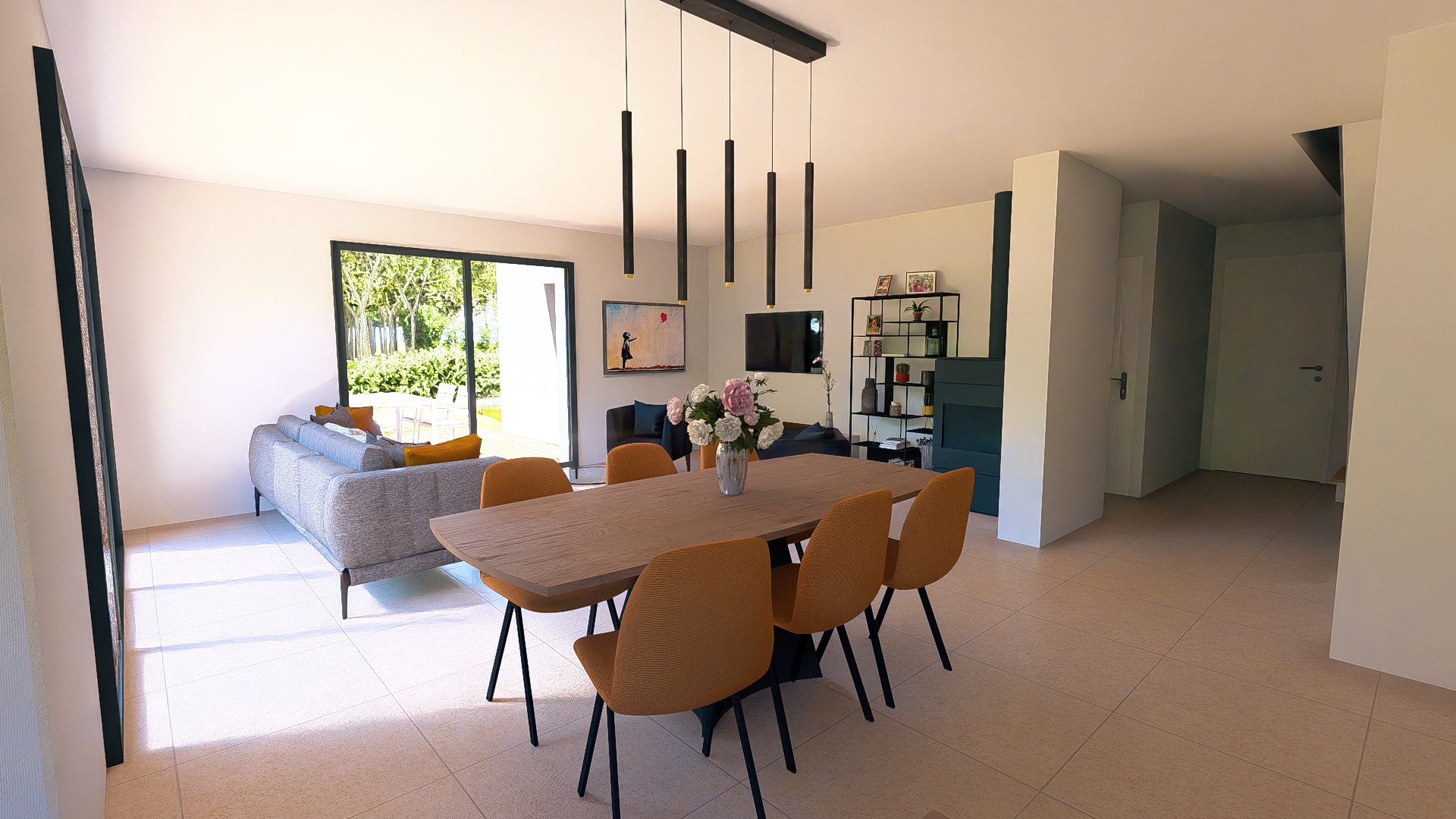 Pièces de vie au RDC, espace nuit à l’étage, circulations fluides.